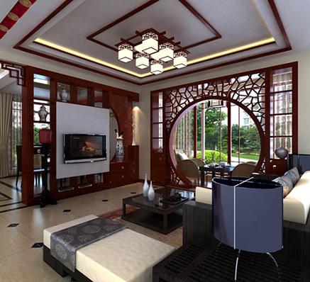 是以中國傳統文化作為背景,在色彩搭配上以黑、紅、為主,室內多采用對稱式的布局方式,格調高雅,造型簡樸優美,色彩濃重而成熟。